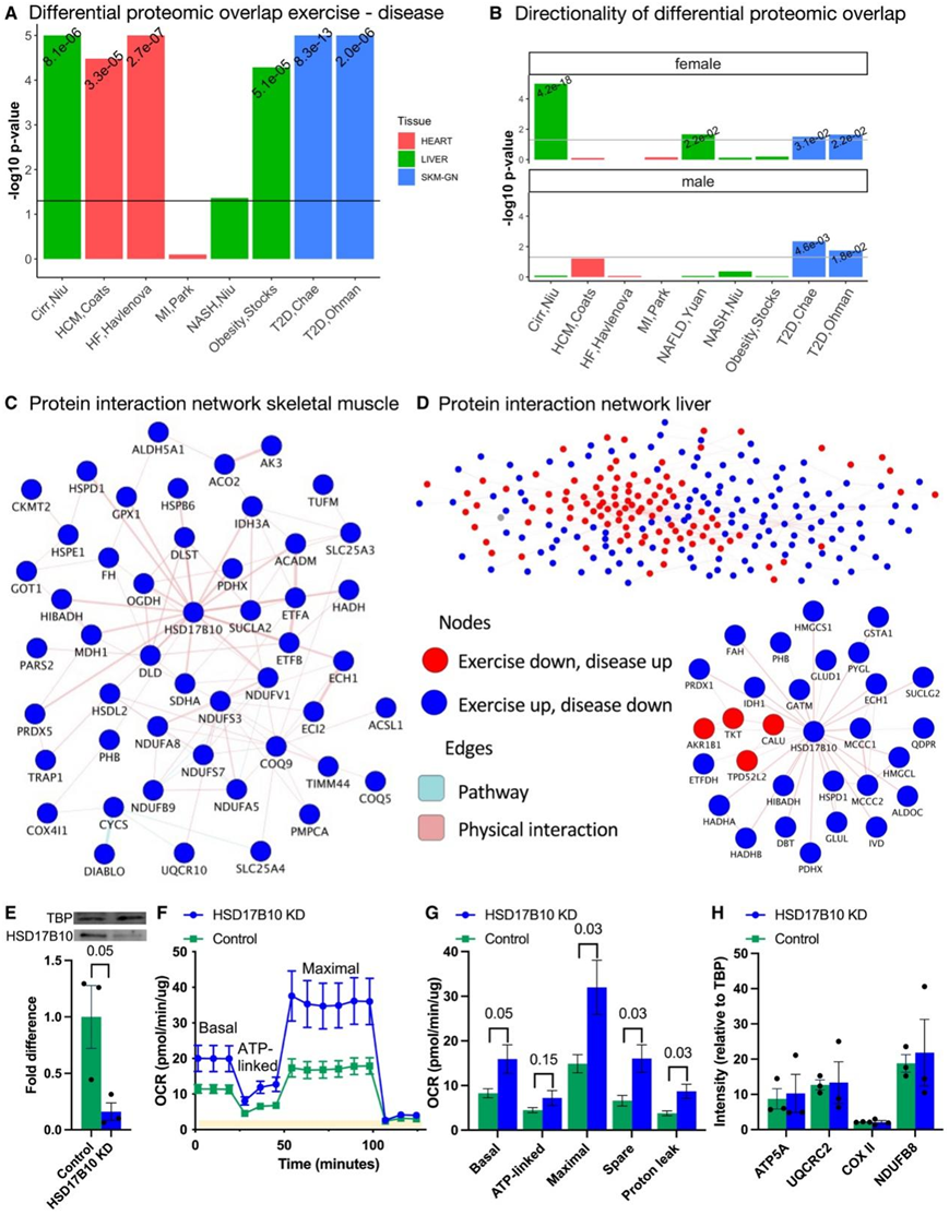 (A)与病例对照蛋白质组学疾病队列中鉴定的蛋白相比,运动调节的差异蛋白之间重叠的意义。(B)比较关于非酒精性脂肪性肝病(NAFLD)的研究中重叠蛋白的意义。(C-D) GeneMANIA蛋白-反向调控的蛋白相互作用网络。(E)小干扰RNA (siRNA)敲除后HepG2细胞中HSD17B10蛋白丰度与阴性对照比较。(F-G)使用Seahorse检测敲低细胞与对照细胞的氧消耗率(OCR)。(H) western blot检测的电子传递链组分蛋白丰度。