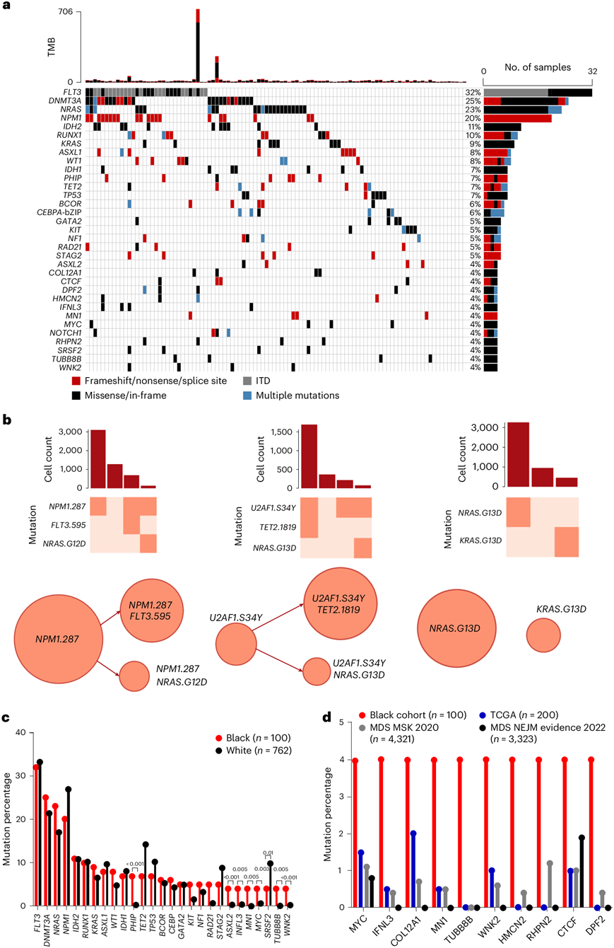 (a) Oncoprint 显示通过 WES 在 4% 或更多黑人患者中检测到突变。(b) 使用 scDNA-seq 确定在三名黑人 AML 患者中检测到的驱动突变的克隆性。(c) 在 4% 或更多黑人患者中发生突变的基因上,白人(Beat AML)和黑人患者之间的突变百分比差异。(d) 与其他主要 AML 测序研究相比,4% 黑人患者中发生突变的基因的突变百分比。