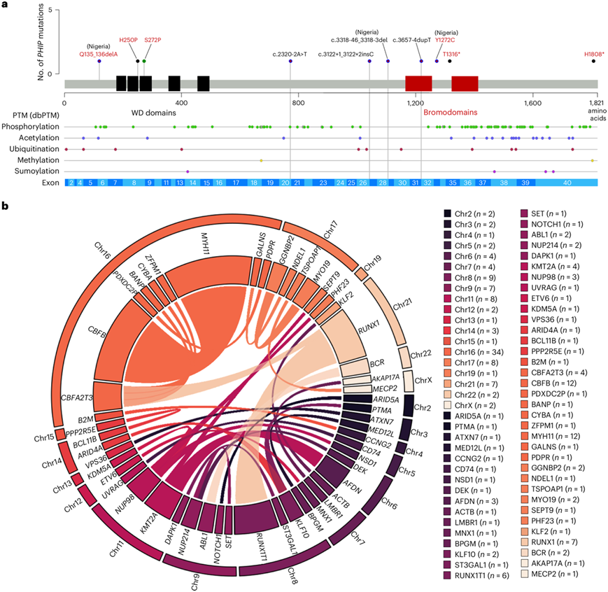 (a) PHIP基因示意图,其中标明了翻译后修饰的位置和 WES 在黑人患者中检测到的突变的位置。(b) Circos 图显示了使用基于 RNA-seq 的发现在黑人患者中检测到的融合基因。