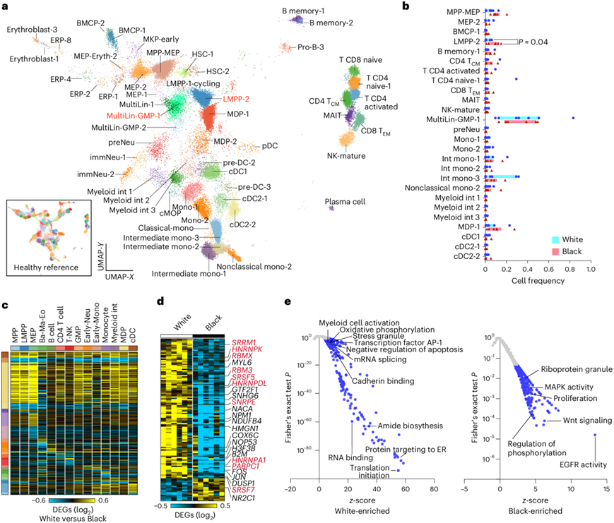 为了阐明导致观察到的表型差异的潜在生物学机制,他们对来自 6 名黑人和 7 名白人且存在NPM1突变的患者的 BM 样本进行了单细胞转录组分析(scRNA-seq)和转录组-表位细胞索引分析 (CITE-seq),共获得 112017 个细胞(图7a)。在 74 个比对的细胞群中,最常比对的细胞状态是注释的 MultiLin-GMP-1聚类(平均 34% 的细胞),这通常是非白血病 BM 中最不常见的过渡中间状态。有趣的是,当比较与祖先相关的细胞类型比例时,淋巴样髓系引发祖细胞 (LMPP-2) 细胞在黑人和白人患者之间显示出一致的差异(图7b)。虽然白血病细胞状态可能是治疗反应的重要介质,但根据祖先区分的转录组影响可以揭示独特的 AML 存活基因程序。为了排除细胞捕获频率的偏差,他们使用软件 cellHarmony 比较了参考注释的伪批量细胞群之间的基因表达。在比较共有的 AML 母细胞祖先程序和细胞状态特异性影响的黑人和白人患者的 scRNA-seq 谱系时,cellHarmony 揭示了细胞状态特异性和谱系影响(图7c)。