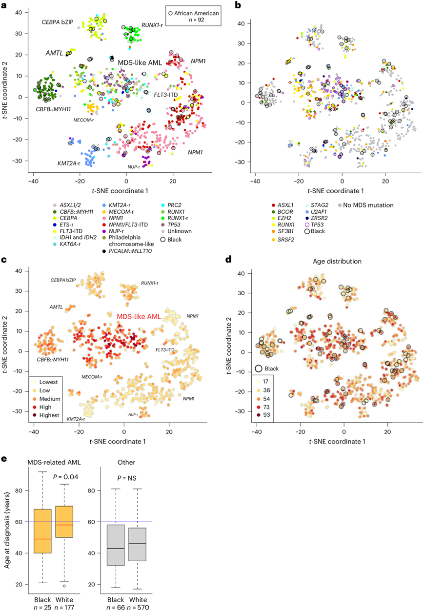 在基于转录组的基因表达分析和t分布随机邻域嵌入 (t-SNE) 数据可视化中,黑人和白人患者根据已知的驱动突变聚集在一起(图3a)。相对较大的中央t-SNE聚类包含有2022欧洲白血病网(ELN)定义的骨髓增生异常相关突变的黑种人和白种人患者样本(图3b)。基因表达分析表明,这些患者具有类似骨髓增生异常肿瘤的表达谱(图3c)。值得注意的是,骨髓增生异常相关聚类中的黑人患者比白人患者年轻,提示存在内在和/或外在导致发育不良的应激源(图3d-e)。此外,虽然骨髓增生异常相关 AML 聚类内的白人患者比该聚类外的白人患者年龄更大,但黑人患者之间没有显著的年龄差异,进一步凸显了黑人患者中骨髓增生异常。