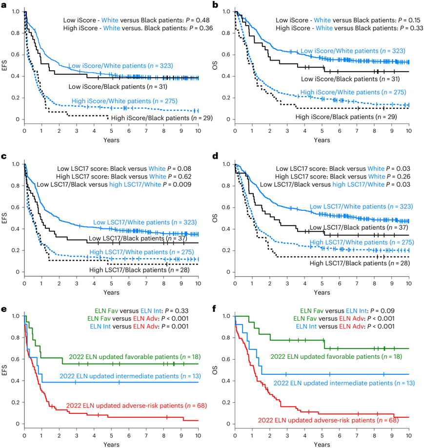 LSC17评分代表了一种经过验证的生存相关基因表达特征,反映了高分AML的“干性”。 LSC17评分可预测白人和黑人患者的EFS和OS(图6c-d)。在黑种人2022 ELN低危患者中,只有53%的LSC17评分低,而在白种人2022 ELN低危患者中,这一比例为69%。值得注意的是,NPM1突变的发生率存在差异:低LSC17的黑种人患者中只有13%有NPM1突变,而白种人患者中有38%有NPM1突变,这提示黑种人和白种人患者之间可能存在的生物学差异,需要进一步研究。同样,低LSC17组中只有16%的黑种人患者携带NRAS突变,而白种人患者中为26%,这与观察到的NRAS突变对生存产生的相反影响一致。NRAS 、IDH1、IDH2和NPM1突变对黑人患者的 OS 和 DFS的不利影响表明这些突变可作为黑人患者的不良风险标志物。事实上,实施这一改变改善了遗传风险分配,2022 ELN有利风险组的 3 年 EFS 和 OS 预测率分别从 37% 提高到 56% 和从 50% 提高到 78%,中等风险患者的 3 年 EFS 和 OS 预测率分别从 28% 提高到 38% 和从 35% 提高到 43%(图6e-f)。