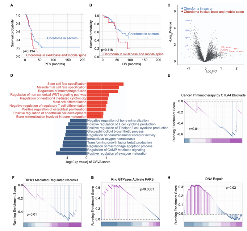 (A-B)生存分析。(C) 骶骨脊索瘤与颅底/活动脊柱之间DEP的火山图。(D) 基于GO数据集BP的GSVA分析。(E-H) GSEA富集分析。