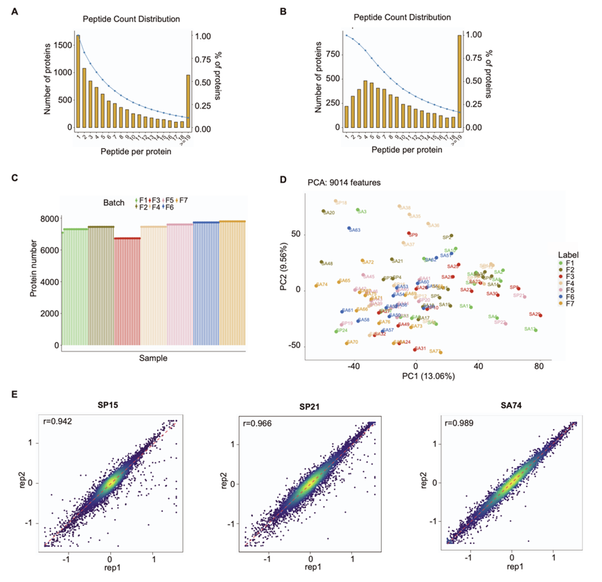 (A-B) 所有鉴定蛋白的肽计数分布。(C) 7批样品中每个样品的蛋白质含量。(D) PCA检验不同TMT批次标记的样品之间批次效应的散点图。(E) 蛋白丰度的Pearson相关性。
