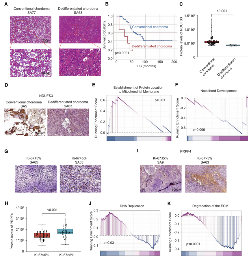(A) 传统和去分化脊索瘤的代表性 H&E 染色。(B) 传统与去分化脊索瘤之间 OS 的 Kaplan-Meier 曲线。(C-D) NDUFS3 的蛋白质水平和代表性 IHC 图像。(E-F) GSEA 富集分析显示,蛋白质定位到线粒体膜和脊索发育存在差异。(G) Ki-67 > 5% 和≤ 5% 的代表性 IHC 图像。(H-I) Ki-67 > 5% 或≤ 5% 的脊索瘤中 PRPF4 的蛋白质水平和代表性 IHC 图像。(J-K) GSEA 富集分析显示,DNA 复制和 ECM 降解存在统计差异。