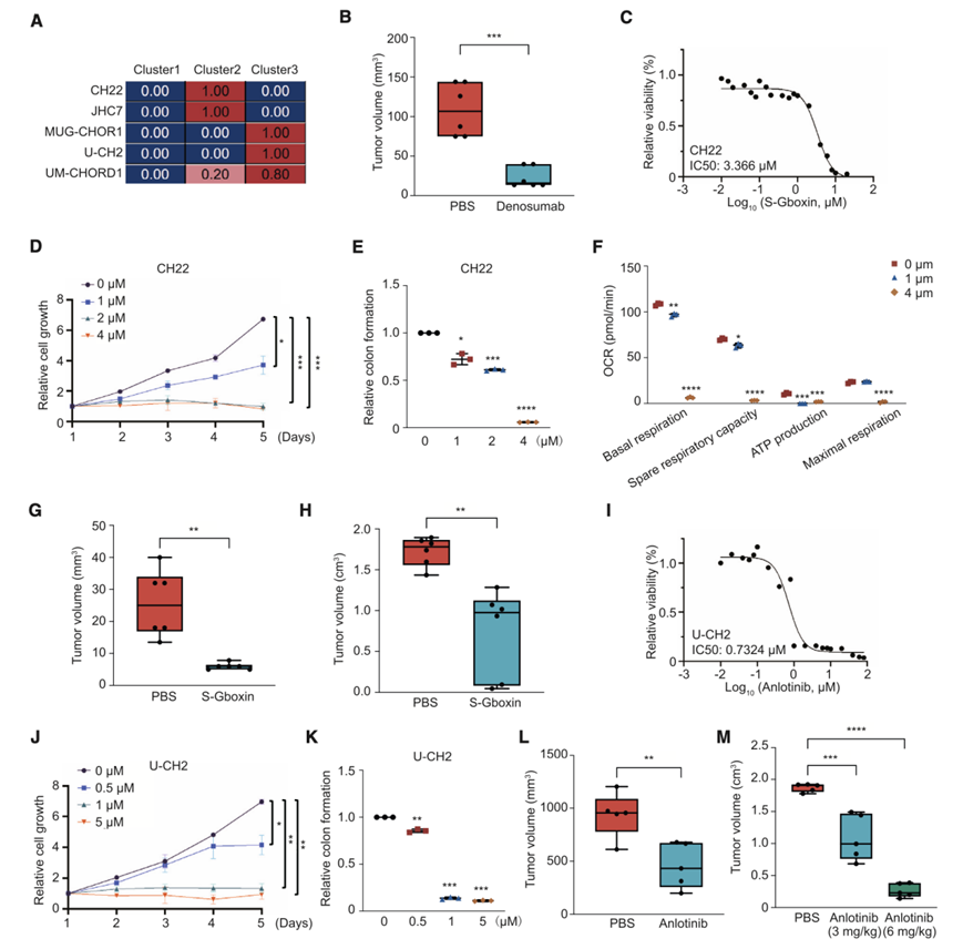 (A) 脊索瘤细胞系与已识别的三个聚类之间的相关性。(B) 地诺单抗和 PBS 处理的 PDX 模型的肿瘤体积。(C) S-Gboxin对CH22细胞的IC50。(D) 细胞增殖分析。(E)克隆形成分析。(F) 细胞耗氧率(OCR)分析。(G-H) 肿瘤体积分析。(I) 安罗替尼对U-CH2细胞的IC50。(J) 细胞增殖分析。(K) 克隆形成分析。(L-M) 肿瘤体积分析。