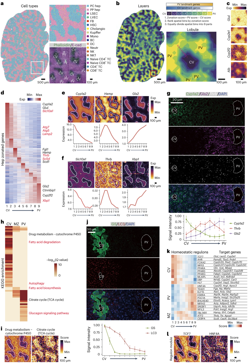 (a) 左:通过 RCTD 反卷积的细胞类型分布的空间可视化(D0-DY1 部分)。右上角:所示区域的放大图。右下:相邻切片的鬼笔环肽和 E-钙粘蛋白 (E-cad) 的代表性免疫荧光染色。(b) 左,分区层的空间可视化(D0-DY1 部分)。右上,计算分区层的方案。右下角,所示区域的放大图。(c) 典型中心周围和门静脉周围基因的空间可视化。(d) 生物重复中所有稳态切片中每个分区层 2456 个肝细胞分区基因的平均表达。(e-f) 上:已知的和新鉴定的分区基因的估算表达的空间可视化(D0-DY1 部分)。下:所有稳态部分的每个分区层中的平均表达水平。(g) 稳态肝脏中Cyp1a2、Gls2和Thrb的代表性 smFISH 图像以及平均信号强度。(h) 肝细胞分区基因的KEGG富集。(i) 指定分区路径的模块得分的空间可视化(D0-DY1 部分)。(j) 上:来自稳态肝脏中 GS 和 LC3 免疫荧光染色的代表性图像。下:平均信号强度。(k) 每个分区层的平均调节子活性(D0-DY1 部分)。(l) 指定调节子的活性得分的空间可视化(D0-DY1部分)。