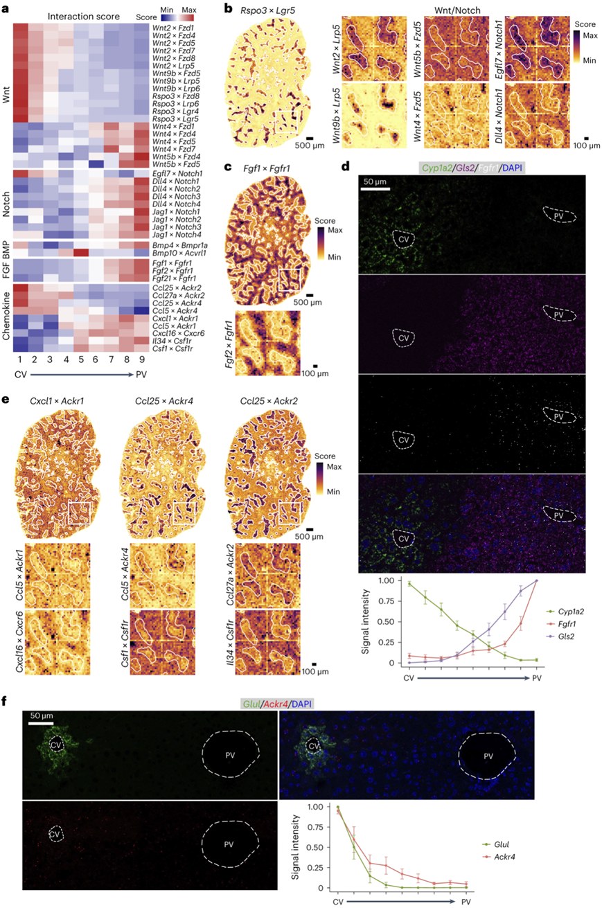 (a) 跨生物复制的所有稳态部分中选定的配体-受体相互作用的每个分区层中的平均相互作用得分。(b) 左:Rspo3 × Lgr5的估算相互作用得分的空间可视化(D0-DY1 部分)。右:指定区域中指定 Wnt/Notch 信号相互作用的估算相互作用得分的空间可视化。 (c) 上:Fgf1 × Fgfr1的估算相互作用得分的空间可视化(D0-DY1 部分)。下:所示区域中Fgf2 × Fgfr1的估算相互作用得分的空间可视化。 (d) 上:稳态肝脏中Cyp1a2、Gls2和Fgfr1的代表性 smFISH 图像。下:平均信号强度。(e) 上:Cxcl1 × Ackr1、Ccl25 × Ackr4和Ccl25 × Ackr2的估算相互作用得分的空间可视化(D0-DY1 部分)。下:指定区域中指定趋化因子-受体相互作用的估算相互作用得分的空间可视化。 (f) 上:稳态肝脏中Glul和Ackr4的代表性 smFISH 图像。下:平均信号强度。
