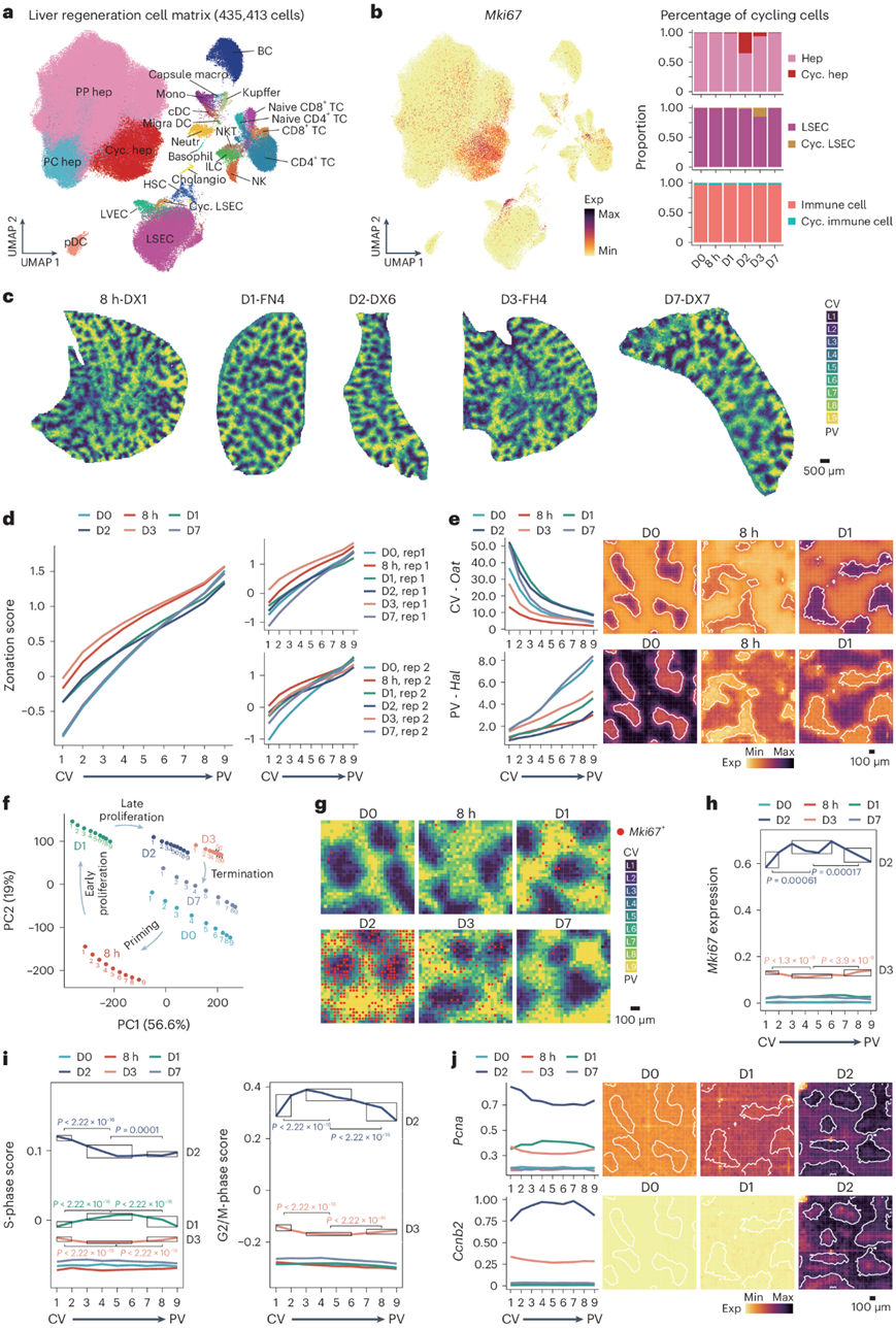 (a) 来自肝再生细胞基质的 435413 个单细胞的均匀流形近似和投影 (UMAP) 图。(b) 左:肝再生细胞基质中Mki67表达的 UMAP 可视化。右:循环肝细胞(上)、LSEC(中)和免疫细胞(下)的百分比。(c) 分区层的空间可视化(第 8 h-DX1、D1-FN4、D2-DX6、D3-FH4 和 D7-DX7 部分)。(d) 左:所有再生部分中每个分区层的平均分区得分。右:再生肝脏不同生物复制切片的平均分区得分。 (e) 左:所有再生部分中每个分区层的代表性标志基因的平均表达水平。右:相应基因的估算表达水平的空间可视化(D0-DY1、8 h-DX1、D1-FN4 部分)。(f) 来自所有再生部分的每个分区层的伪体数据的主成分分析。(g) Mki67 + bin在每个时间点的空间可视化。(h) 所有再生部分中每个分区层的Mki67平均表达水平。(i) 所有再生部分中每个分区层的S 期(左)和 G2/M 期(右)基因的平均模块得分。 (j) 左:所有再生切片中每个分区层的S 期基因Pcna和 G2/M 期基因Ccnb2的平均表达水平。右:相应基因的估算表达水平的空间可视化(D0-DY1、D1-FN4、D2-DX6 部分)。