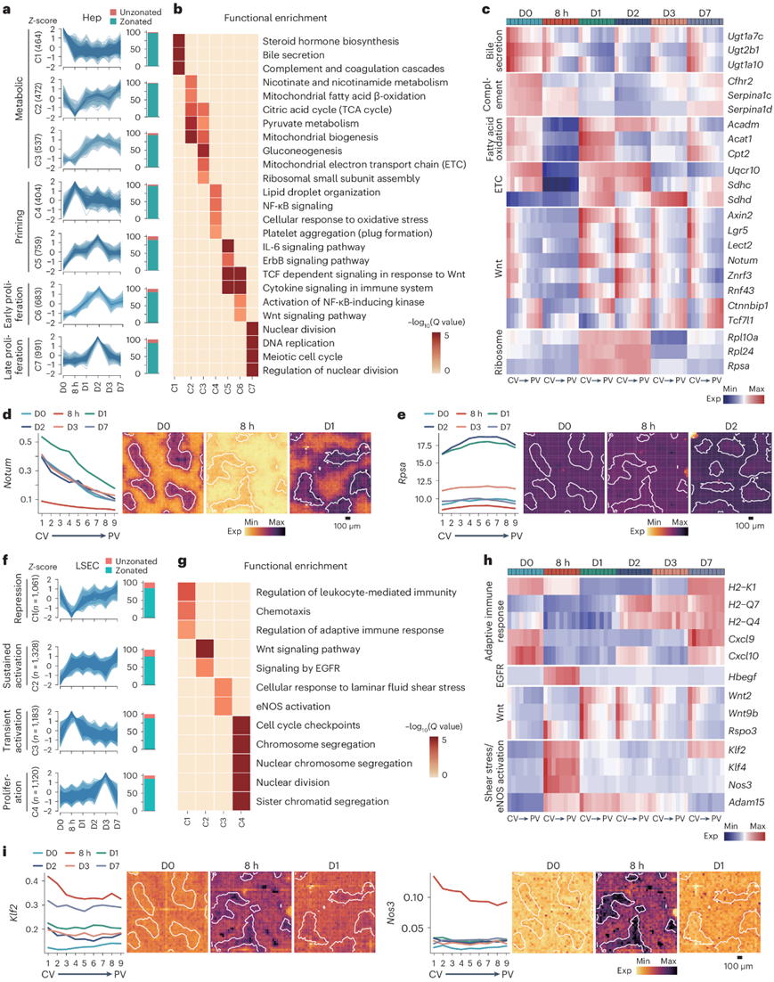 (a,f) 左:肝再生细胞基质的伪块数据的模糊聚类分析,显示肝细胞中不同时间点上有 4310 个高变基因,LSEC 中不同时间点上有 4692 个高变基因。右:每个基因组中区域基因的百分比。(b,g) 肝细胞和 LSEC中每个高变基因组的功能富集。(c,h)选定肝细胞高变基因和 LSEC 高变基因的平均表达。 (d,e,i) 左:所有再生切片中每个分区层中所示肝细胞高变基因[包括Notum、Rpsa 和 LSEC 高变基因(Klf2和Nos3)]的平均表达。右:所示时间点相应基因估算表达水平的空间可视化。