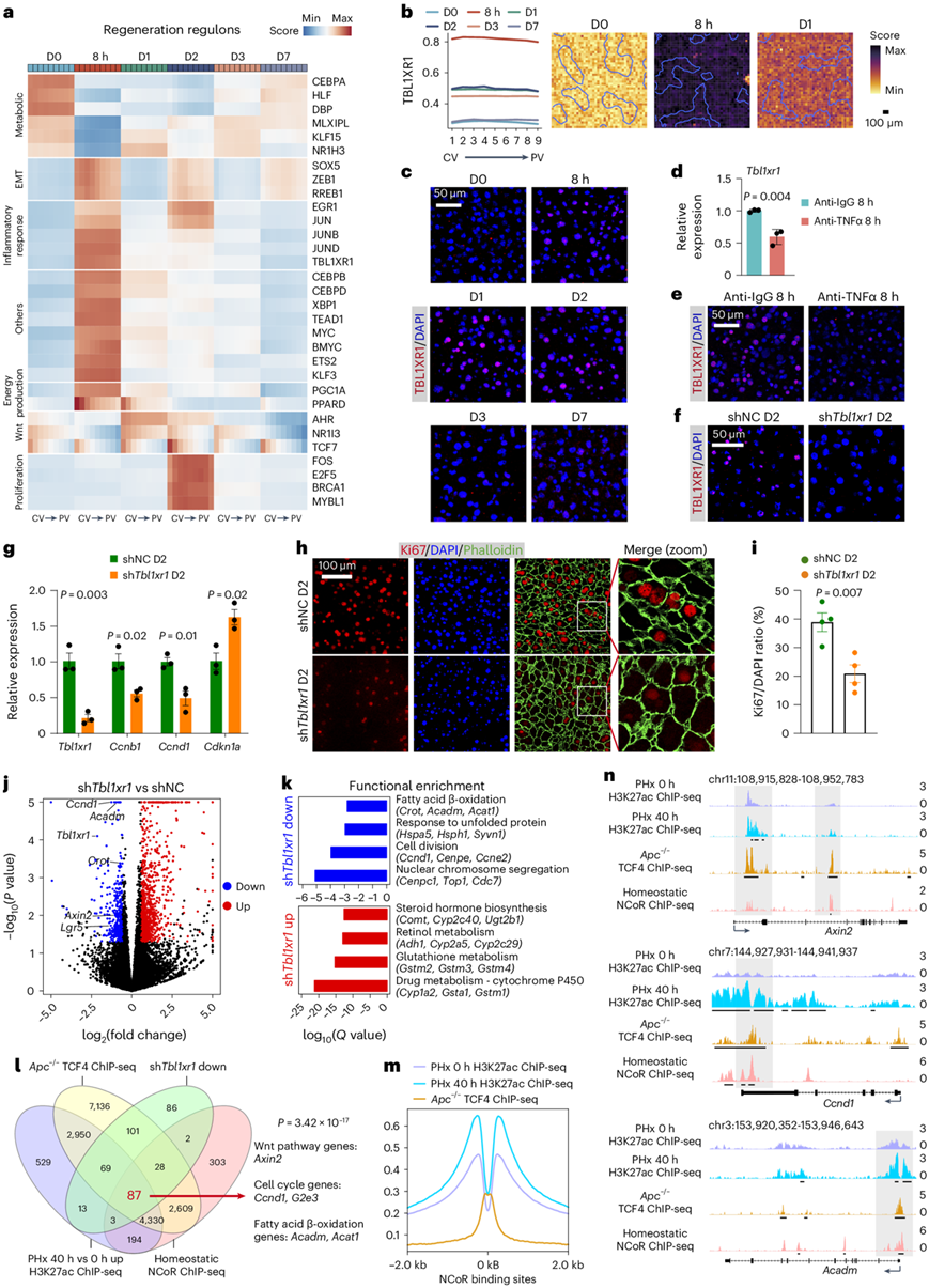 (a) 每个分区层的平均调节子活性(D0-DY1、8h-DX1、D1-FN4、D2-DX6、D3-FH6 和 D7-DX7 部分)。(b) 每个分区层的平均活性(左)和 TBL1XR1 调节子在指定时间点的空间可视化(右)。(c) 再生肝脏TBL1XR1免疫荧光染色的代表性图像。(d) 抗TNFα或对照治疗后PHx后8小时对Tbl1xr1进行RT-qPCR。(e-f)免疫荧光染色的代表性图像。 (g) 在 PHx 后 D2 时对Tbl1xr1和细胞周期相关基因进行 RT-qPCR 。(h) 免疫荧光染色分析。(i) 对照肝脏和Tbl1xr1敲低肝脏中 PHx 后 D2 时 Ki67 +细胞核与所有细胞核的比率。(j) 火山图显示在 PHx 后 D2 时 比较对照和Tbl1xr1敲低肝脏的DEG。(k) 已确定的 DEG 的功能富集。(l) 四向维恩图显示指定数据集中基因的重叠。 (m) TCF4 和 H3K27ac ChIP-seq 在 NCoR 结合位点的堆积密度图。(n) TCF4、NCoR 和 H3K27ac ChIP-seq 在指定位点的基因组浏览器视图。