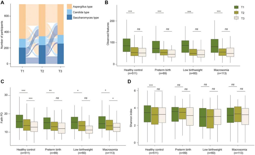 他们研究了 750 名拥有所有妊娠期 ITS2 测序数据的参与者在怀孕期间的组成变化。结果显示,从 T1 到妊娠中期(T2),微生物群落组成发生了整体变化,但从 T2 到妊娠晚期(T3)并没有发生变化。在 750 名参与者中,多达 68.5% 的参与者在怀孕期间经历了真菌肠型的变化(图 3A)。具体来说,从 T1 到 T3,以酵母菌为主导的肠型比例增加,而以曲霉菌为主导的肠型比例减少,整个妊娠期间念珠菌为主的肠型比例相对稳定。