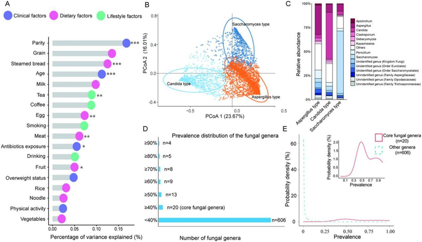 他们观察到三种真菌肠型,包括以酵母菌为主导的肠型(26.5%)、以念珠菌为主导的肠型(18.8%)和以曲霉菌为主导的肠型(54.7%)(图 2B-C)。生育史和饮食因素(包括馒头和茶)是影响真菌肠型的最重要因素。具体而言,妊娠早期具有以酵母菌为主导的肠型的女性更有可能是初产妇,并且在过去一年内有吃馒头的饮食偏好。另一方面,以念珠菌为主导的肠型的女性在过去一年内更有可能有以喝茶为特征的生活方式。值得注意的是,酵母菌、念珠菌和曲霉菌是三种最常见的真菌,而肠道菌群的总体流行率非常稀少(图 2D-E)。具体来说,他们在 T1共鉴定出 626 个真菌属,其中超过 96%的真菌属的流行率低于 40%。在后续分析中,他们将 40% 以上的参与者中存在的真菌属视为核心真菌属。
