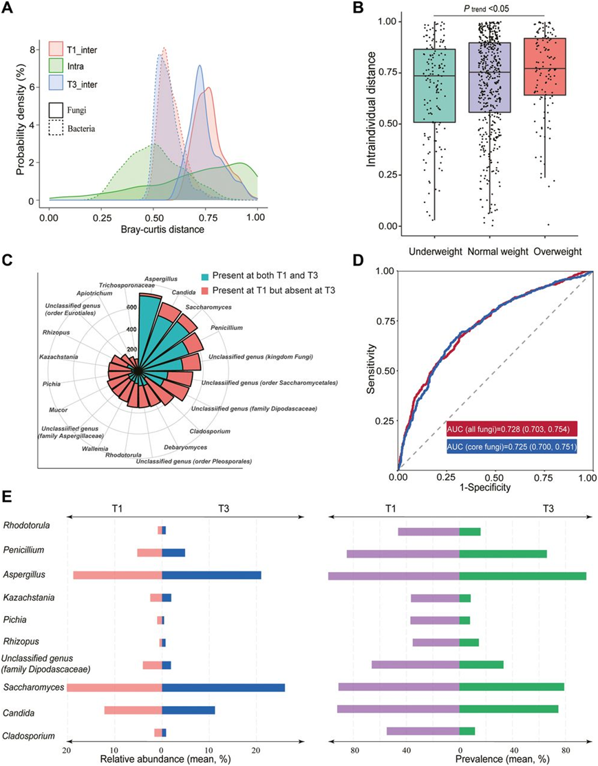 (a) 个体内肠道真菌和细菌组成随时间(从 T1 到 T3)变化的分布,以及 T1 或 T3 时个体之间的差异。(b) 按妊娠前超重状况分层,比较个体内肠道真菌组组成随时间(从 T1 到 T3)变化的程度。 (c)南丁格尔玫瑰图可视化了与妊娠早期相比,妊娠晚期核心肠道真菌属丢失的参与者比例。 (d)使用机器学习框架,特别是 LightGBM,对 T1 和 T3 时肠道真菌组组成的妊娠期分类器进行训练。 (e) 该图显示了对 T1 和 T3 妊娠期分类有贡献的前 10 个肠道真菌属的相对丰度(左)和流行率(右)。