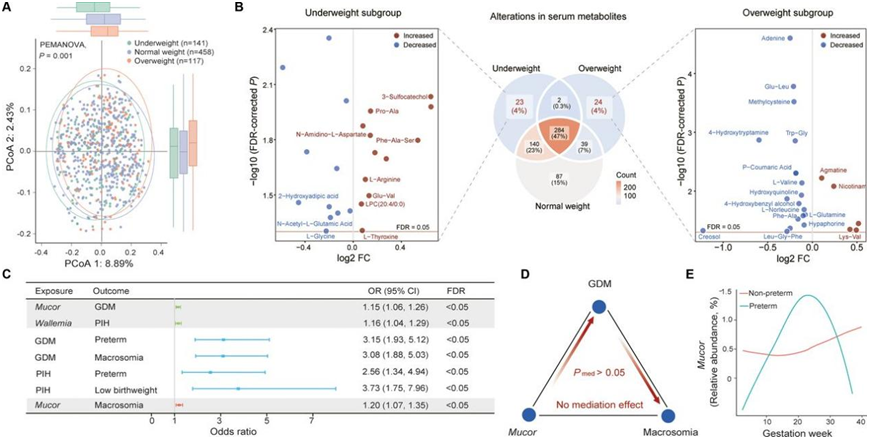 图6. 按妊娠前超重状态分层的独特代谢变化以及妊娠期间肠道真菌群的临床意义。
