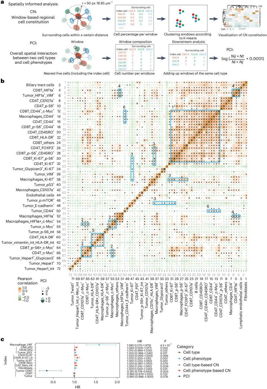 (a) PCI 似然比和定义 CN 的计算示意图。(b) 所有区域的72种细胞类型或表型之间的成对相关性和 PCI。(c) 发现队列中指示特征的 HR 。