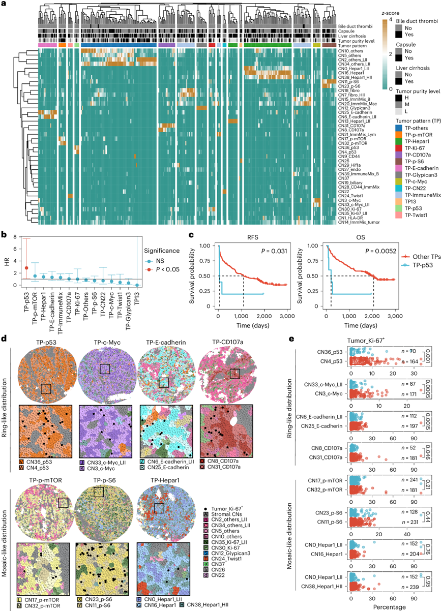 研究团队试图探究基于功能生态位的聚类是否可以更好地解释肿瘤间异质性并分层预后。首先,他们在基于细胞类型的 CN 上尝试了这种方法,并确定了三个主要聚类,即高、中、低肿瘤纯度水平,这些聚类不能用于分层预后。接下来,基于细胞表型的 CN 上的层次聚类确定了 14 种肿瘤模式(图3a)。肿瘤模式 TP-p53 与显著更高的复发风险相关(图3b),并且与所有其他患者相比具有不同的临床结果(RFS 和 OS)(图3c)。值得注意的是,在 TP-p53 样本中观察到 p53 蛋白的显性核定位。考虑到肝细胞癌中 p53 的突变和失活频率较高,这表明细胞核中异常 p53 的积累可能导致肝细胞癌的进展。