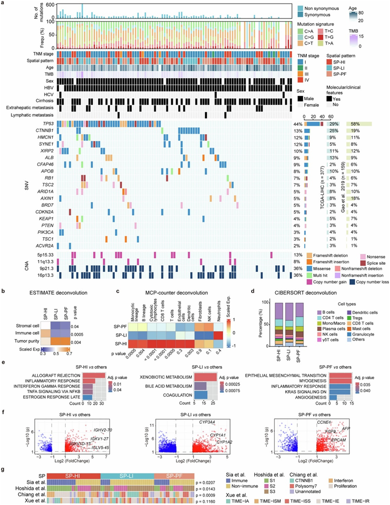 (a) 97 名 HCC 患者的基因特征和相关临床病理特征。(b) 热图使用 ESTIMATE 反卷积方法显示基质细胞、免疫细胞和肿瘤纯度的 z 分数估计分数。(c) 热图显示了 SP-HI、SP-LI 和 SP-PF 中不同免疫和基质细胞群的 z 分数丰度。(d) 条形图显示 SP-HI、SP-LI 和 SP-PF 中免疫细胞群的构成。(e) SP-HI相对于其他(左)、SP-LI相对于其他(中)和 SP-PF相对于其他(右)中显著上调的 DEG 的 Hallmark 通路富集。(f) 火山图显示 SP-HI 相对于其他(左)、SP-LI 相对于其他(中)和 SP-PF 相对于其他(右)中代表性上调的DEG。(g) 每个样本的预测分子亚类。