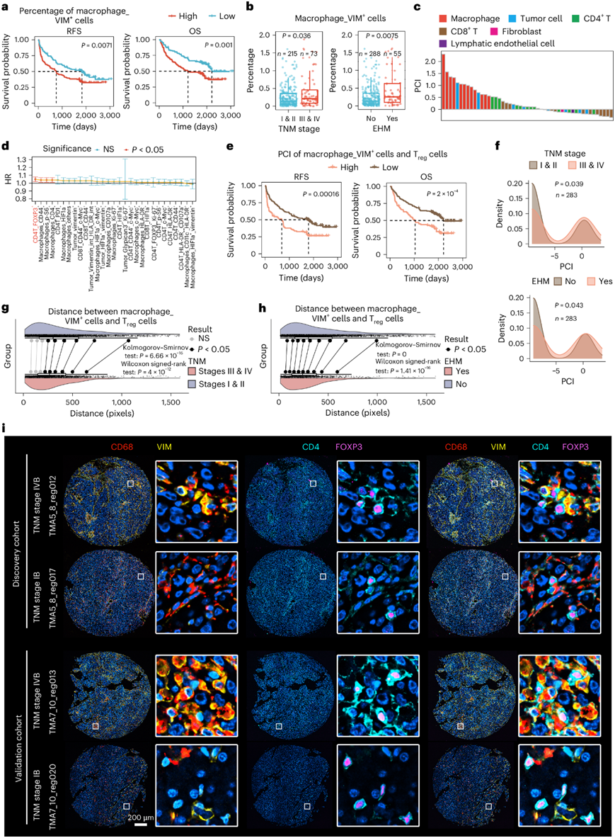 (a) Kaplan-Meier 生存曲线。(b) 箱线图显示不同组样品中巨噬细胞_VIM+细胞的百分比。(c) 细胞相互作用表型。(d) 细胞表型之间的 PCI HR。(e) Kaplan-Meier 生存曲线。(f) T reg和 macrophage_VIM +细胞之间的 PCI 密度图。(g-h) Treg和 macrophage_VIM+细胞之间的距离差异。(i) TNM 阶段 IVB 和 IB 区域的代表性图像。