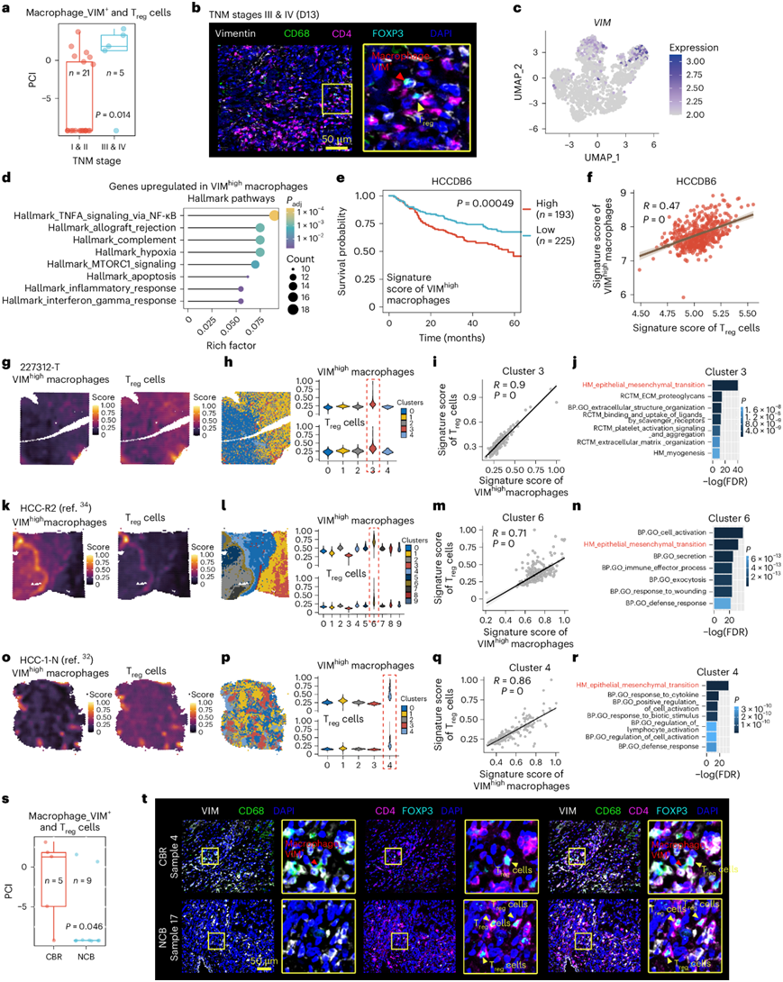 (a) Treg和巨噬细胞_VIM+细胞之间的 PCI 箱线图。 (b) TNM III 期和 IV 期T reg和巨噬细胞_VIM +细胞之间相互作用的代表性图像。(c) 巨噬细胞亚群中VIM表达水平的 UMAP 图。(d) 标志通路富集分析。(e) 生存曲线。(f) HCCDB6中所示特征分数之间的双侧 Pearson 相关性 。(g,k,o) 所示特征分数的空间特征图。(h,l,p) ST点的无偏聚类(左)和小提琴图显示聚类中所示特征分数。(i,m,q) 双侧Spearman相关性。(j,n,r) 基因集富集分析(GSEA)。(s)T reg与 macrophage_VIM +细胞之间的 PCI 箱线图。(t) 代表性免疫染色。