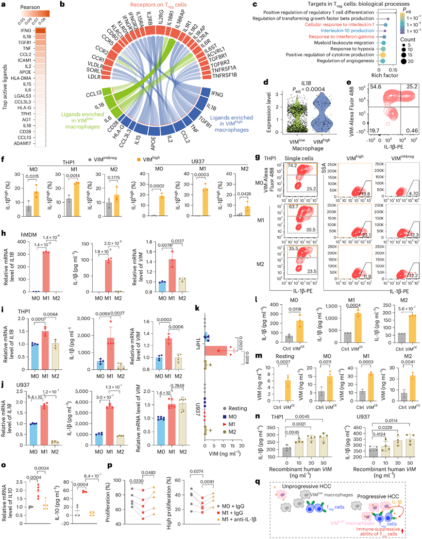 (a-c) NicheNet 分析。(d) 小提琴图显示 VIMhigh和 VIMlow巨噬细胞中IL1B的表达水平。 (e) 流式细胞分析。(f-g) 流式细胞分析。(h-j) IL1B 的 mRNA 水平(左) 、IL-1β 的分泌水平( 中)和VIM 的mRNA水平。(k) VIM 的分泌水平。(l) IL-1β分泌水平。(m) VIM分泌水平。(n) 重组人VIM处理后M0巨噬细胞中VIM分泌水平的变化。(o) Treg细胞中的 mRNA 水平和 IL-10 分泌水平。(p) Treg体外抑制试验。(q) 图形说明 VIMhigh巨噬细胞-IL-1β-Treg细胞调节轴在促进 HCC 进展中的作用。