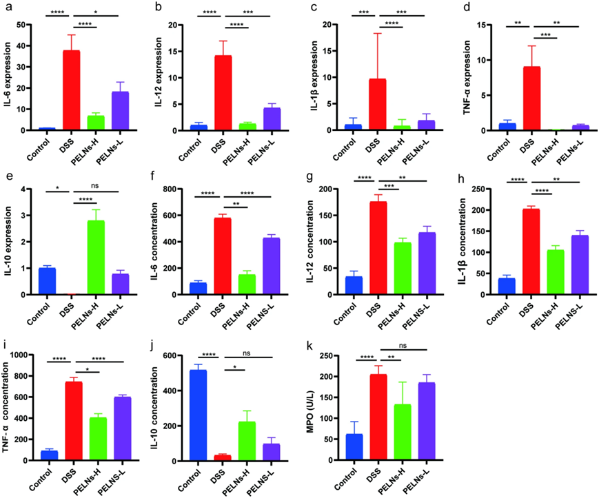 众所周知,促炎细胞因子在肠道炎症中起着至关重要的作用。与健康对照组相比,DSS对照组中的促炎细胞因子的水平(IL-6、IL-12、IL-1β和TNF-α)显著升高(图 2a、b、c和d)。然而,用PELNs治疗显著抑制这些促炎细胞因子的表达(图2a、b、c和d)。相反,IL-10,一种抗炎细胞因子,在DSS对照组中表现出与健康对照组相比显著下降,而其水平在PELNs组中显着增加(图2e)。ELISA实验证明,DSS对照组促炎细胞因子分泌水平显著增加(IL-6、IL-12、IL-1β和TNF-α),与中性粒细胞相关的标志物髓过氧化物酶(MPO)也增加(图 2f ,g, 2 h, 2i和 2k)。然而,用PELNs治疗显著降低了这些促炎细胞因子和MPO的分泌水平(图2f ,g, 2 h, 2i和 2k)。同样,PELNs亦促进IL-10的分泌(图2j)。值得注意的是,与PELNs-L相比,PELNs-H在小鼠结肠炎治疗中在减少促炎细胞因子和增加抗炎细胞因子方面表现出更好的效果。