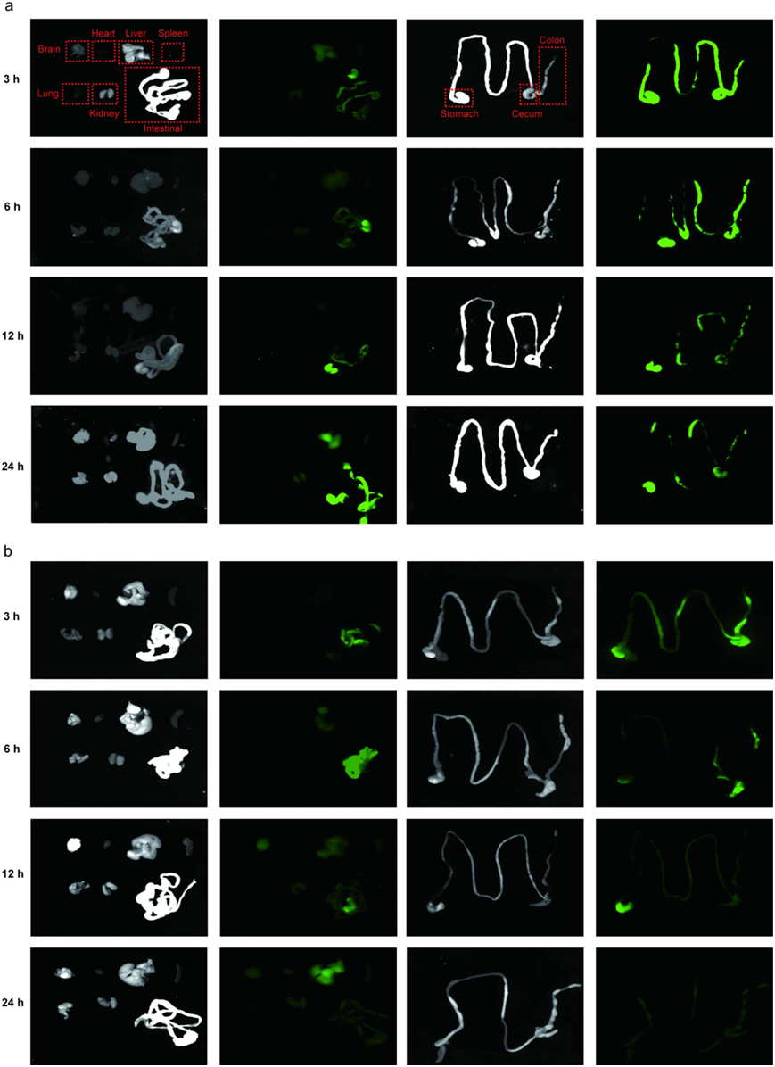 胃肠道的荧光图像揭示了不同时间点(3,6,12和24 h)口服IRDye 800CW标记的PELN的体内生物分布:(a)急性结肠炎小鼠(b)健康小鼠