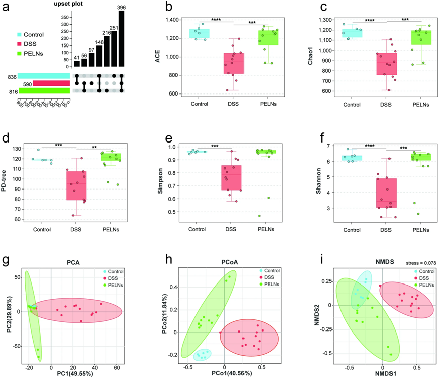 16SrDNA测序分析肠道菌群分布。通过计算OTU的数量来评估肠道微生物群的丰度,与结肠炎小鼠相比,PELNs处理后显著增加(5a)。为了进一步评估PELNs对α-多样性的影响,作者检查了五个多样性指数:ACE(图 5b),Chao1 (图5c),PD-tree(图5d),Simpson(图5e),Shannon(图5f)。DSS诱导的结肠炎导致α-多样性的显著下降,PELNs治疗显著增加了α-多样性。通过使用PCA(图5g),PCoA(图5h)和NMDS(图 5i)评估不同组肠道菌群之间β-多样性的差异,作者在所有三种方法中观察到与α-多样性一致的结果。分析表明,PELNs显著改变了结肠炎小鼠的微生物结构,使其更接近健康对照组。总体而言,这些发现表明PELNs治疗调节了结肠炎小鼠肠道菌群的组成和结构,导致α-多样性增加,微生物结构恢复到更健康的状态。
