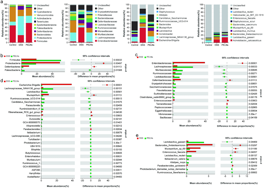 a:堆叠条形图描绘了每组小鼠肠道菌群的结构。从左到右分为门、科、属和种; b-e:Welch's t检验分析PELNs在门、科、属和种水平介导的微生物变化
