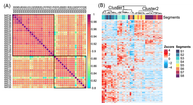 为了分析每个肝段的非酒精性脂肪性肝炎 (NAT) 的多组学概况,他们采用 Kruskal-Wallis 检验计算并筛选出来自 8 个肝段的 1209 个 DEP。利用这些 DEP,他们进行了相关性分析,并将来自 8 个肝段的 NAT 样本分成两组,主要对应于肝脏的左叶和右叶(图S2A)。随后,他们对这些 DEP 进行了无监督的层次聚类,结果将 NAT 样本分为两类:聚类 1,主要代表左叶(包括 S1-S4),聚类 2,对应于右叶(包括 S5-S8)(图S2B)。