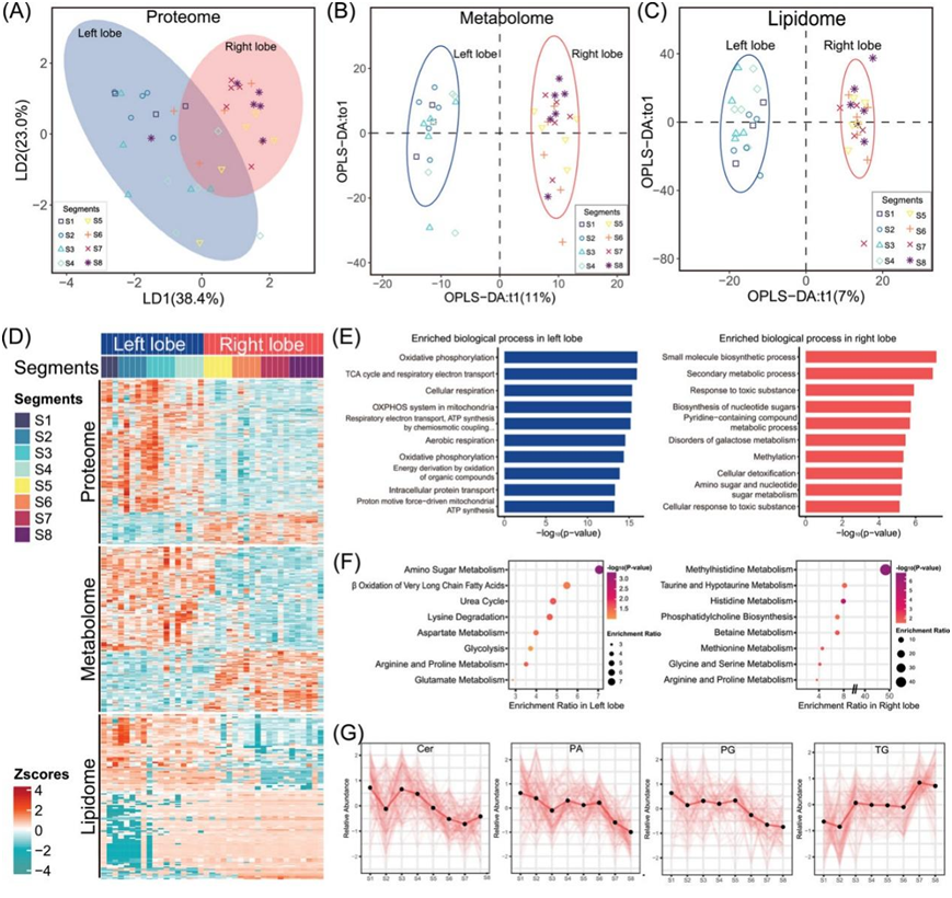 (A)NAT 样本蛋白质组中的线性判别分析 (LDA) 主要分为肝脏的左叶(包括 S1,下同)和右叶。椭圆阴影表示 95% 置信区间 (95% CI)。(B-C)NAT 样本代谢组 (B) 和脂质组 (C) 中的正交偏最小二乘判别分析 (OPLS-DA) 揭示了左叶和右叶之间的明显划分。左叶和右叶样本分别用蓝色和橙色表示。(D)热图显示左叶和右叶之间 NAT 样本的失调蛋白质组、代谢组和脂质组。(E)左叶和右叶中 DEP 的富集分析分别为蓝色和橙色。(F)左叶和右叶失调代谢组的 MSEA。 (G) 折线图显示肝脏 8 个节段中四种脂质组的相对丰度。