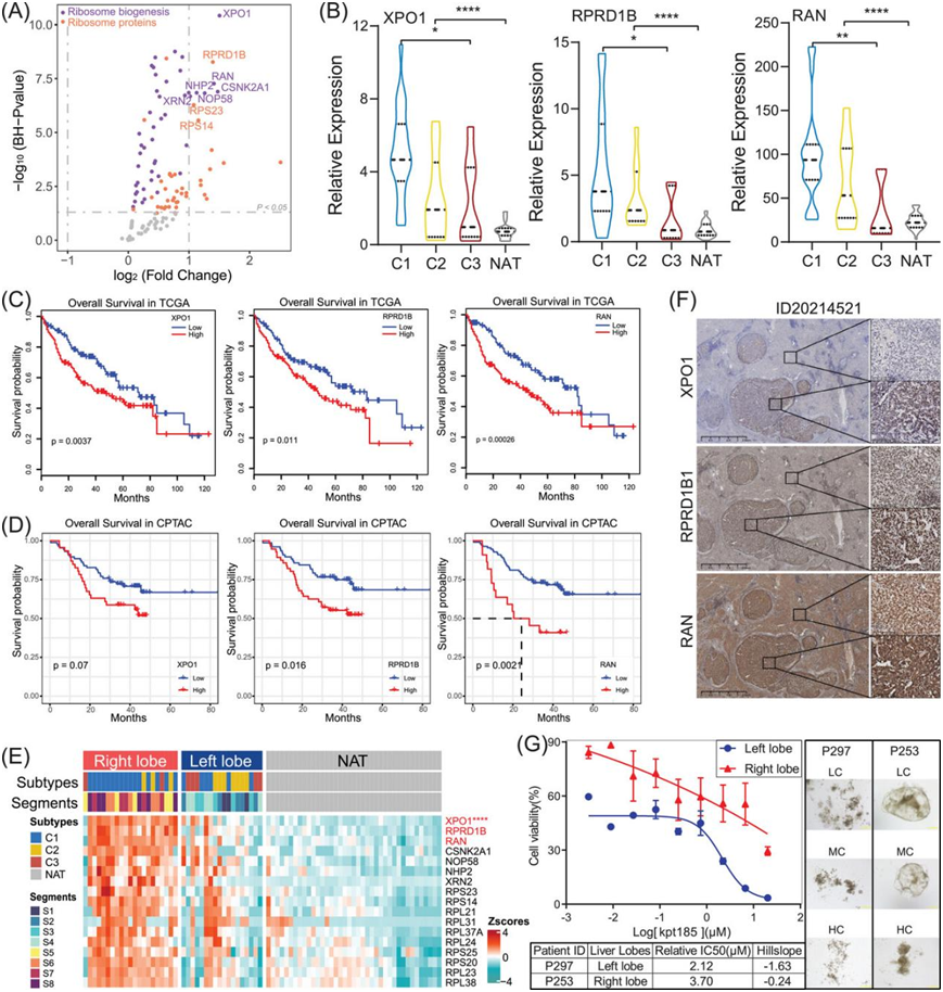 (A)散点图描绘了与 NAT 组相比,在 TT 中几乎上调的核糖体生物合成相关蛋白(RB,紫色点)和核糖体蛋白(RP,橙色点)。候选蛋白(调整p值 < 10 −5,log 2 FC| > 1)在图中标记。(B)小提琴图显示 XPO1、RPRD1B1 和 RAN 的候选蛋白在蛋白质组亚型和 NAT 组中的表达有显著差异。(C)基于 TCGA HCC 队列中 XPO1、RPRD1B1 和 RAN 的转录表达的总生存率的 Kaplan-Meier 曲线。(D)基于 CPTAC HCC 队列中 XPO1、RPRD1B1 和 RAN 的蛋白质表达的总生存率的 Kaplan-Meier 曲线。 (E) 热图显示左叶、右叶和 NAT 组中候选 RB 和 RP 的相对表达,包括 XPO1、RPRD1B1 和 RAN 蛋白。 (F) IHC 验证了 TT 和 NAT 样本中 XPO1、RPRD1B1 和 RAN 的相对表达。 (G) 证实从 HCC 肿瘤组织中获得的 PDO 对 XPO1 抑制剂 (Kpt185) 敏感,左叶和右叶的 IC50分别为 2.12 和 3.7。