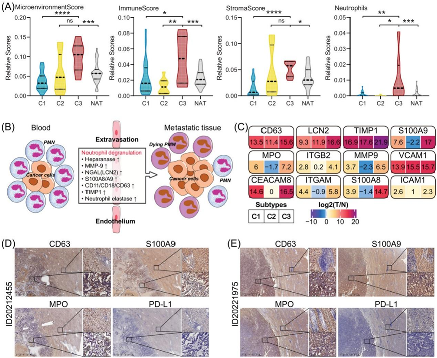 (A)小提琴图显示不同 HCC 亚型和 NAT 样本的免疫(包括中性粒细胞)和基质的估计评分存在显著差异。(B)示意图显示了中性粒细胞脱颗粒在癌症转移中的可能机制。(C)中性粒细胞的蛋白质在不同的 HCC 蛋白质组亚型中存在不同的表达,例如 CD63、LCN2、S100A9、MPO、ITGB2、MMP9、VCAM1、CEACAM8、ITGAM、S100A8 和 ICAM1。(D-E) IHC 分析验证了 ID20212455和 ID20221975患者的 TT 和 NAT 样本中 CD63、S100A9、MPO 和 PDL1 的相对表达。