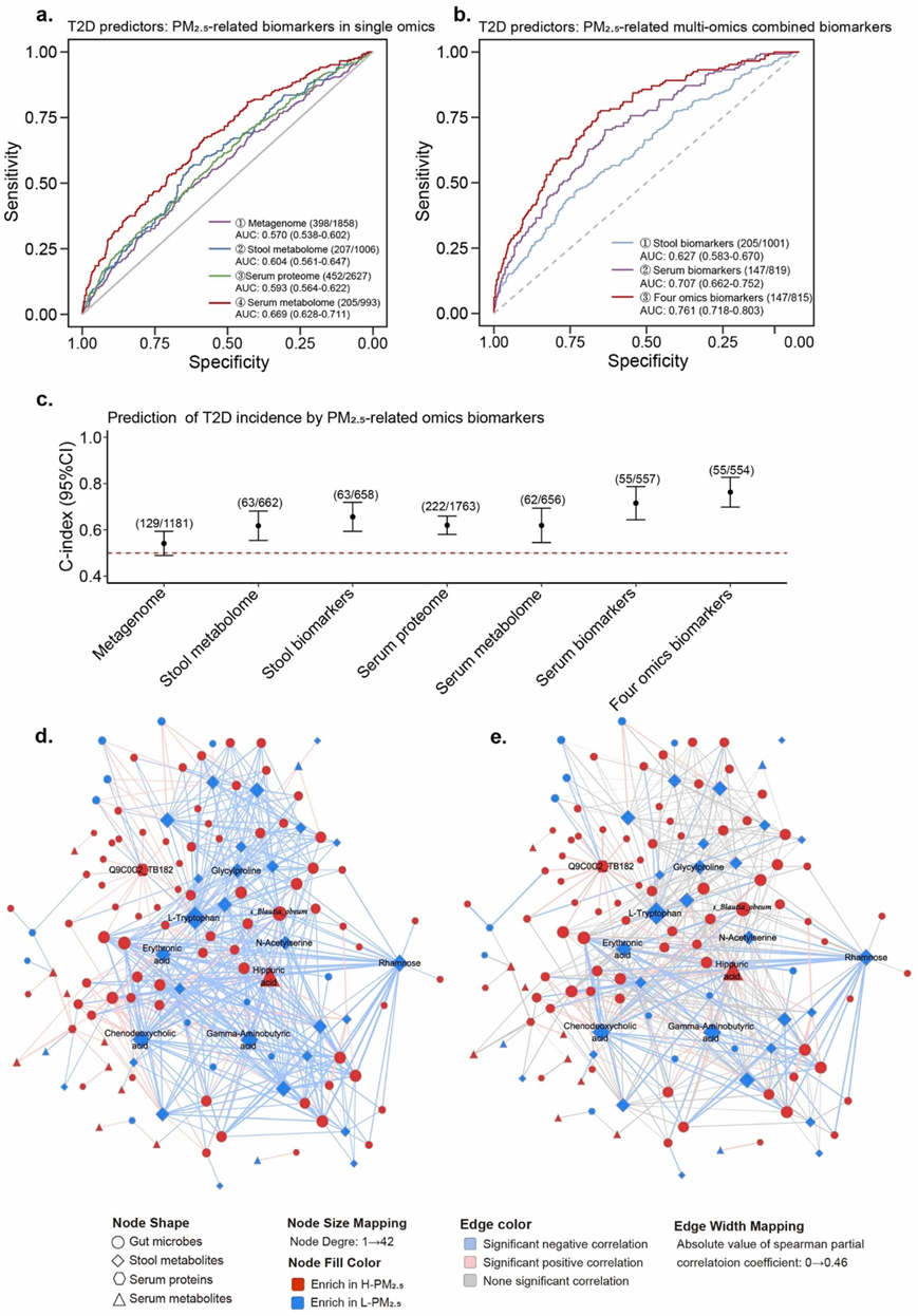 (a) 显示使用单一组学标志物预测 2 型糖尿病患病率模型的 ROC-AUC。(b) 描述使用组学标志物组合预测 2 型糖尿病患病率模型的 ROC-AUC。(c) 说明使用 PM 2.5相关生物标志物预测 2 型糖尿病发病率的 Cox 比例风险模型的 C 指数。(d) 显示四个组学特征(粪便微生物宏基因组和代谢组、宿主血清代谢组和蛋白质组)之间的网络关联。(e) T2D 参与者之间的相同网络关联。
