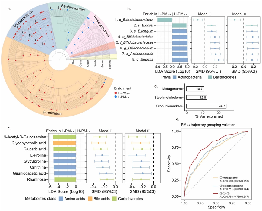 (a) 鉴定出 110 个具有显著组间差异的细菌分类群。(b) 展示模型Ⅱ中 H 和 L-PM 2.5组之间 FDR p < 0.1 的微生物生物标志物的 LDA 得分和标准化平均差异 (SMD) 。(c) 展示模型Ⅱ中 H- 和 L-PM2.5组之间 FDR p < 0.1的粪便代谢物。(d) 表示粪便微生物宏基因组和代谢组的生物标志物单独和组合解释的 PM2.5分组方差的百分比。 (e) 展示使用筛选的标志物的 PM2.5分组有效性预测模型的受试者工作特征 (ROC-AUC) 曲线下面积。