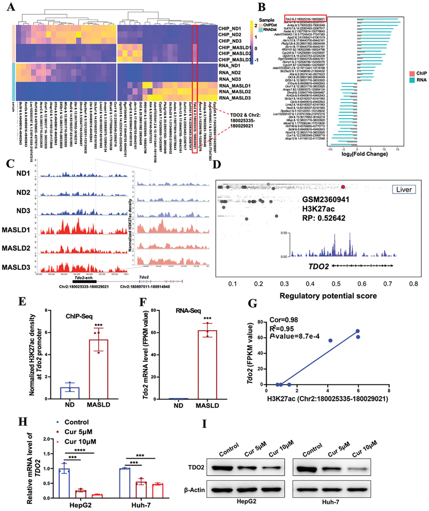 (a) ChIP-seq 和 RNA-seq 数据的热图显示 ND 和 MASLD 组之间的 H3K27ac 富集和转录水平差异。(b) ChIP-seq 和 RNA-seq 中前 20 个 H3K27ac 峰基因的变化条形图。 (C) Tdo2上 H3K27 乙酰化的差异密度。(D) H3K27ac 是肝脏中TDO2基因的组蛋白修饰标记。(E) 使用 ChIP-seq 数据比较 MASLD 大鼠与 ND 大鼠中Tdo2基因的 H3K27ac 密度。(F) MASLD 大鼠相对于 ND 个体的Tdo2 mRNA 表达水平。(G) Tdo2表达水平与 H3K27ac 峰(chr2:180025335-180029021)密度之间的相关性。(H-I) 分别通过 qRT-PCR 和免疫印迹法测定用指定浓度的姜黄素 (Cur) 处理的 HepG2 和 Huh-7 细胞中TDO2的 mRNA 和蛋白质水平。