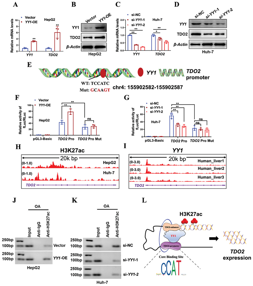 图3. YY1通过调节 H3K27ac诱导TDO2上调。