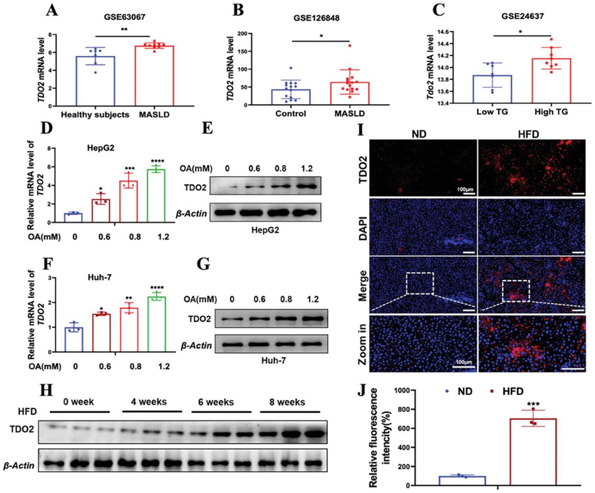 为了研究TDO2在肝细胞脂肪变性中的功能性作用,他们首先检测了其在 MASLD 中的表达模式。GEO 数据分析显示,与健康正常人相比,MASLD 患者肝脏组织中TDO2表达升高(图 4A-B),与低 TG 水平的小鼠相比,高 TG 水平小鼠肝脏组织中 TDO2表达水平升高(图4C)。此外,OA 以剂量依赖性方式诱导 HepG2 和 Huh-7 细胞中的 TDO2表达(图4D-G)。与体外细胞脂肪变性模型的结果一致,与 ND 喂养的大鼠相比,HFD 喂养的大鼠也表现出更高的肝脏TDO2表达(图4H-J)。总之,这些发现表明TDO2上调与肝脏脂肪变性有关,支持其作为 MASLD 背景下的生物标志物或治疗靶点的潜在作用。