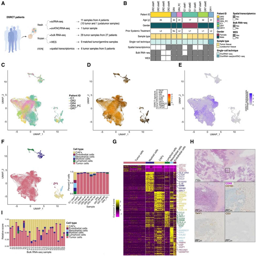 (A) DSRCT 的单细胞多组学分析。(B) 患者和样本特征。(C) UMAP显示Int_sc数据集来源样本。(D) UMAP 显示 DSRCT 特征分数。(E) UMAP 显示 DSRCT 新转录本表达。(F) UMAP(左图)和条形图(右图)突出显示了 DSRCT 细胞亚群。(G) 热图显示Int_sc细胞类型前 50 个 DEG 的表达Z分数。(H) THY1、CD68/CD163 和 CD3 的 H&E 和 IHC 染色。(I)DSRCT bulk RNA-seq 细胞亚群反卷积分析。