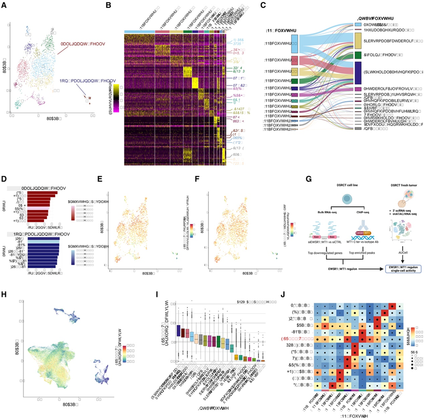 (A) GR11 样本 snMultiome WNN 聚类的 UMAP。(B) 热图显示WNN snMultiome 聚类中前 10 个 DEG 的表达Z分数。(C) WNN snMultiome 数据集上Int_sc聚类的特征转移。(D) 条形图显示恶性细胞和非恶性细胞中前 10 个富集基序。(E) UMAP 显示 snMultiome 分析中的 EWSR1::WT1 染色质可及性特征分数。(F) UMAP 显示 EWSR1::WT1 靶向基因座特征分数在 snMultiome 分析中。(G) 单细胞 EWSR1::WT1 调节子活性推断的图形表示。(H) UMAP 显示Int_sc数据集中的 EWSR1::WT1 调节子活性。(I)箱线图表示每个Int_sc聚类的 EWSR1::WT1 调节子活性。(J) 热图点图显示由调节子特异性评分 (RSS) 定义的最特异性调节子的基因 AUC。