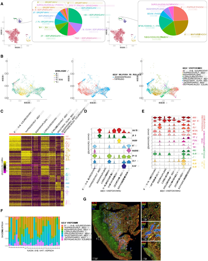 (A)以饼图表示的Int_sc浸润性髓系(左图)和淋巴系(右图)亚群比例。(B) UMAP 图根据患者 ID(左)、来源组织(中)和子聚类(右)显示 CAF。(C)热图突出显示CAF亚聚类前 50 个 DEG 的表达Z分数。(D) 小提琴图显示了典型标记的CAF 亚聚类的表达谱。(E) 小提琴图显示免疫抑制标记的CAF亚群的表达谱。(F) DSRCT bulk RNA-seq CAF 亚群反卷积分析。(G)免疫荧光染色。