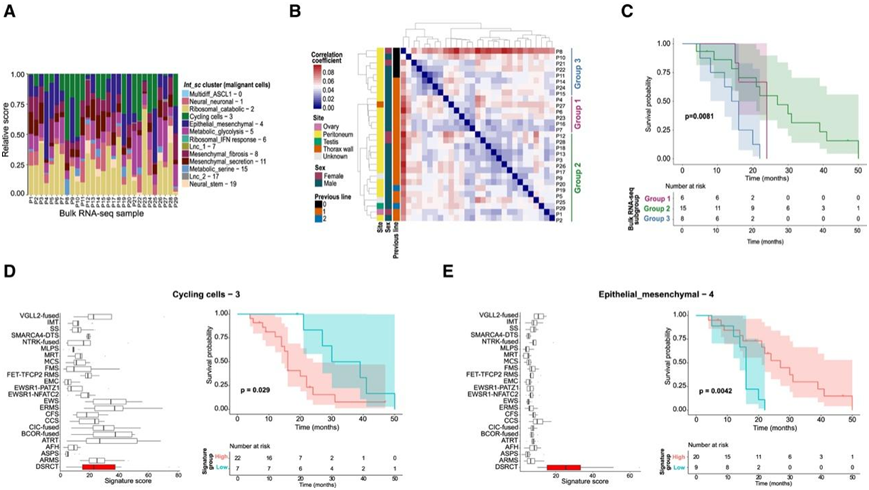 (A)bulk RNA-seq Int_sc聚类反卷积分析。(B) bulk RNA-seq 样本层次聚类突出显示三个不同的亚组。(C)根据 DSRCT bulk RNA-seq 层次聚类绘制的 Kaplan-Meier 总体生存图。(D-E) 细胞特征评分的特异性和预后意义。
