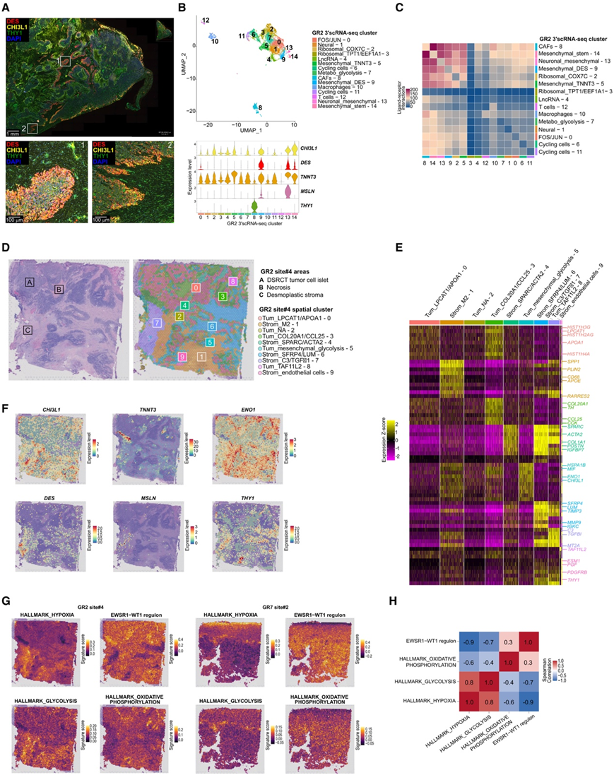 (A) 免疫荧光染色突出显示 GR2 样本上的间充质 DSRCT 肿瘤细胞 (DES+ 和/或 CHI3L1+)和 CAF (THY1+)。(B) UMAP 显示 GR2 3′ scRNA-seq 聚类(上),小提琴图(下)显示肿瘤细胞间充质标志物CHI3L1、DES 、 TNNT3和MSLN 的表达。(C) GR2 样本中细胞聚类之间的配体-受体相互作用,代表所有样本。(D)用于 Visium 检测的 GR2 位点#4 样本注释的 H&E 染色载玻片以及斑点聚类的空间表示。(E) 热图突出显示了GR2 位点#4 的Visium 分析中斑点聚类中前 10 DEG 的表达Z分数。(F)使用 Visium 分析法对 GR2 位点#4 样本中的CHI3L1、TNNT3、ENO1、DES、MSLN 和 THY1表达水平进行空间表示。(G) GR2 位点#4 和 GR7 位点#2 样本中 HALLMARK_HYPOXIA、GLYCOLYSIS、OXPHOS 和 EWSR1::WT1 调节子的空间基因特征得分。(H) Visium 检测中基因特征与 EWSR1::WT1 调节子之间的 Spearman 相关系数中位数。
