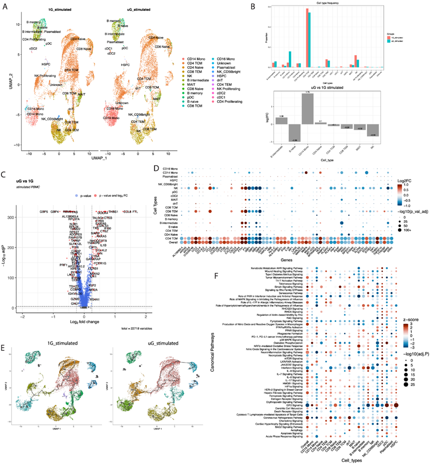 (a) UMAP可视化。(b) 在模拟 uG 和 1G 条件之间,通过百分比或 log2Fold Change (FC) 对每个单个 PBMC聚类的相对丰度进行量化。 (c) uG 和 1G之间所有免疫细胞类型的差异表达基因 (DEG) 的火山图。(d) 点图显示DEG及其在 22 个免疫细胞群中的表达水平。 (e) 1G 和模拟 uG 未刺激 PBMC的轨迹分析的UMAP。(f) 从Ingenuity Pathway Analysis (IPA) 获得的典型通路富集分析显示在 19 个免疫细胞聚类中。