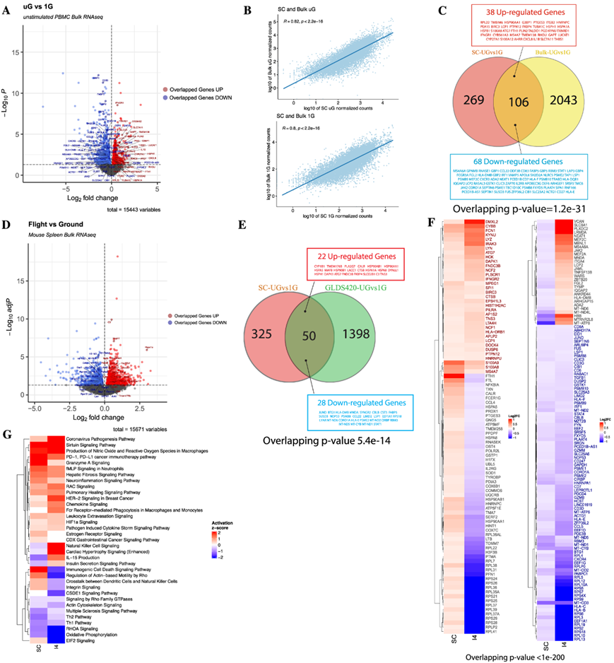(a) 模拟 uG 与 1G(25 小时)bulk RNA-seq的 DEG 火山图。 (b) 在模拟uG和1G条件下单细胞和bulk RNA-seq之间标准化计数的Spearman相关性。 (c) 维恩图总结了单细胞和bulk RNA-seq之间重叠的 DEG。(d) 飞行与地面小鼠bulk RNA-seq (GLDS-420) 的 DEG火山图 。(e) 小鼠直系同源 DEG 之间的重叠 DEG 。(f) 人类 PBMC数据集之间重叠 DEG 的热图。 (g) 从人类 PBMC SC(单细胞 RNA-seq uG vs 1G)和 I4(n = 4,R + 1 vs L-44)之间的 DEG 中富集的 IPA 典型通路热图。