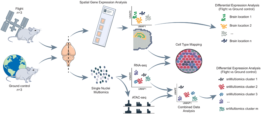 本项研究将单细胞核多组学(转录组学和染色质可及性)与空间转录组学相结合,以阐明太空飞行对雌性小鼠大脑的影响,对地面动物和太空飞行动物的比较分析揭示了大脑基本过程的重大改变,包括神经发生、突触形成和突触传递,特别是影响皮层、海马、纹状体和神经内分泌结构。此外,观察到星形胶质细胞活化和免疫功能障碍的迹象。在通路水平上,一些太空飞行引起的大脑变化与神经退行性疾病表现出相似性,其特点是氧化应激和蛋白质错误折叠。综合空间多组学方法是了解太空飞行引起的中枢神经系统损伤(在单个大脑区域和细胞类型水平)的重要手段,并为未来太空飞行研究的比较提供基础。