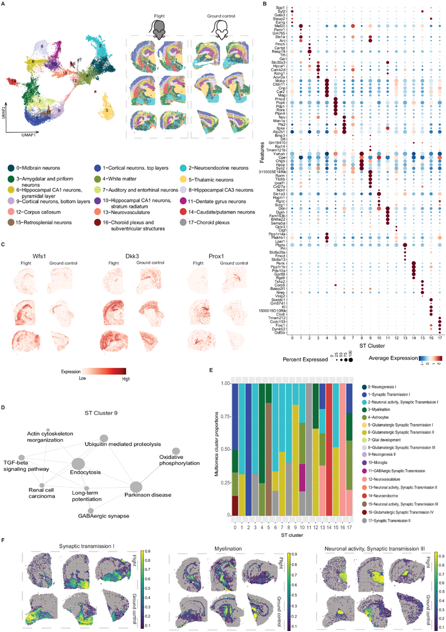 (a) 在飞行和地面对照小鼠脑切片上可视化的空间转录组学数据聚类、聚类注释和聚类的空间位置。 (b) 每个ST 聚类的标记基因可视化为点图。(c) 三个飞行(左栏)和三个地面对照(右栏) ST 切片中 3 个基因(海马 CA1 区的 Wfs1、海马 CA1 和 CA3 区的 Dkk3 和齿状回的 Prox1)的空间分布。(d) ST 聚类 9(皮质神经元,底层)中飞行和地面对照之间的通路存在显著差异。(e) 可视化单核多组学识别的聚类数量及其在每个 ST 聚类中的比例。(f) 细胞类型比例映射到三个地面控制(上)和三个飞行(下)小鼠脑切片的空间坐标。