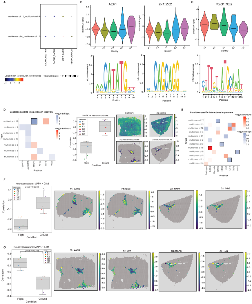 (a) 点图显示了 CellPhoneDB 在两个相互作用的多组学聚类(4 和 11)之间发现的差异表达配体受体对。(b) 飞行小鼠和地面对照小鼠的多组学聚类4 中基序 Atoh1、Zic1 和 Zic2 的可及性差异。 (c) 飞行和地面对照小鼠多组学聚类 11 中 Pou5f1 和 Sox2 基序的可及性差异。(d) (左)调整后的 MISTy 在内部视图中发现的差异相互作用的p值。(中)MAPK 通路活性与神经血管丰度的相关性,并映射到两个样本的 Visium 载玻片上(右)。(e) 显示 MISTy 在 paraview 中发现的差异相互作用。(f) 包含血管内皮细胞的 Glis3 活性(左)和 MAPK 活性的 Pearson 相关性(n = 6 个单独的 ST 小鼠样本,3 个飞行样本,3 个地面对照样本)及其在 Visium 载玻片中的各自活性(右侧 4 个图)。 (g) 包含血管内皮细胞的斑点内的 Lef1 活性(左)和 MAPK 活性的 Pearson 相关性,以及它们在 Visium 载玻片中的各自活性(右侧 4 个图)。