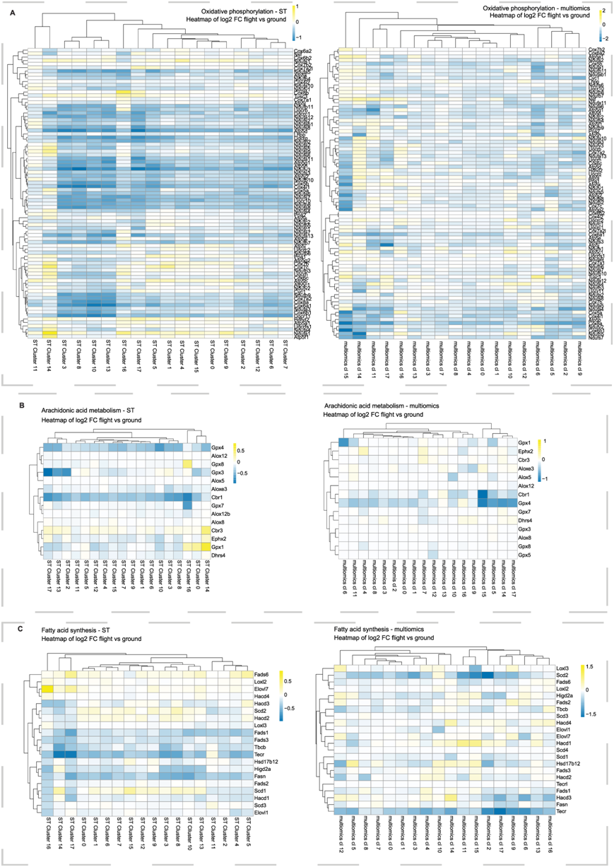 (a) 热图显示 ST 和多组学数据集中氧化磷酸化通路中飞行和地面对照样本之间的差异倍数。(b) 热图显示 ST 和多组学数据集中花生四烯酸代谢途径中飞行和地面对照样本之间的差异倍数的log2值(log2FC)。(c) 热图显示 ST 和多组学数据集中脂肪酸合成途径中飞行和地面对照样本之间的log2FC。