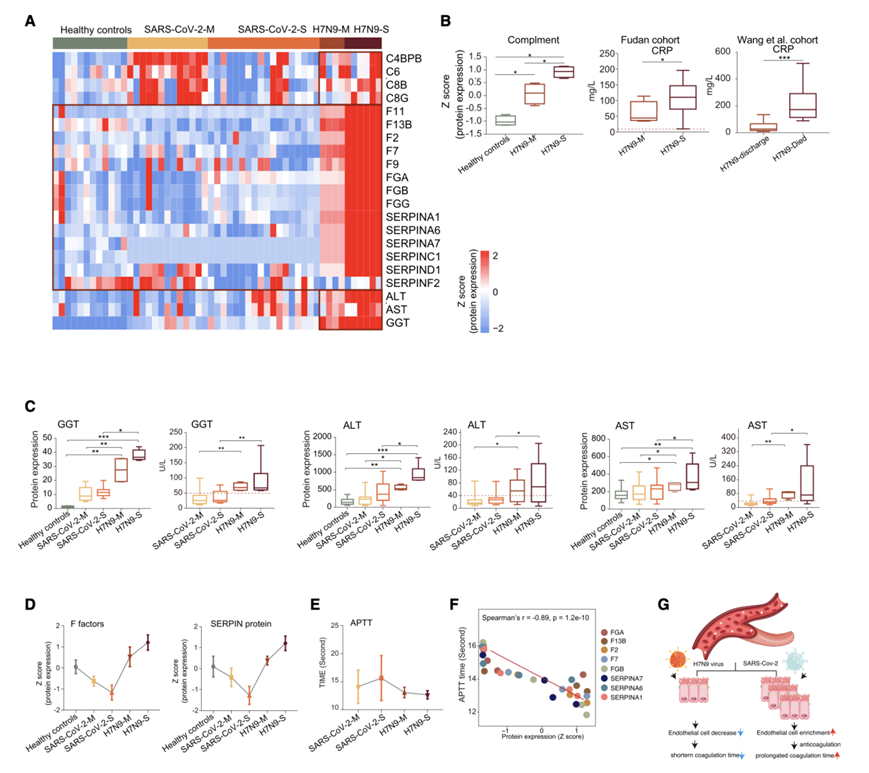 (A) 热图显示了不同感染患者肝脏增强蛋白的表达模式。(B) 箱线图显示本研究队列(中)和 公开队列(右)中样本的补体蛋白质表达水平(左)和临床检测到的 CRP。(C) 箱线图分别表示样本中的蛋白质表达水平(左)和临床检测到的 GGT、ALT 和 AST(右)。(D-E) 图表显示样本中 F 因子(左)和 SERPIN(右)的蛋白质表达水平以及临床检测到的 APTT。(F) F 因子、SERPIN(x 轴)和临床检测到的 APTT(y 轴)的蛋白质表达的 Spearman 等级相关性。(G) 系统图总结了 H7N9 和 SARS-CoV-2 病毒对宿主凝血系统的不同影响。